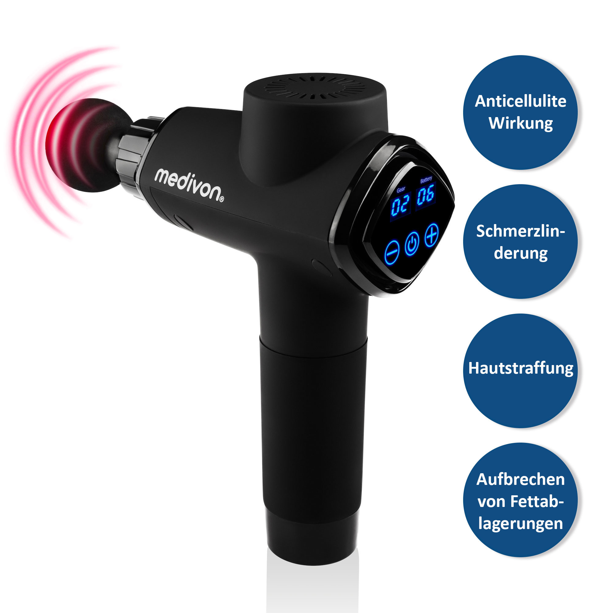 Die Konkurrenz überwertet die RPM-Parameter ihrer Geräte. Ein höherer RPM bedeutet nicht, dass das Gerät besser funktioniert, im Gegenteil. Für eine effektive Massage muss der Vibrationsbereich zwischen 1750 und 3000 U/min (Umdrehungen pro Minute) liegen. Dies ermöglicht es, das Muskelgewebe in einer Tiefe von 16mm zu stimulieren, wodurch die Hydratation des Fasziengewebes erhöht, die Muskeln entspannt, Nährstoffe zugeführt und Toxine und unnötige Metaboliten entfernt werden.