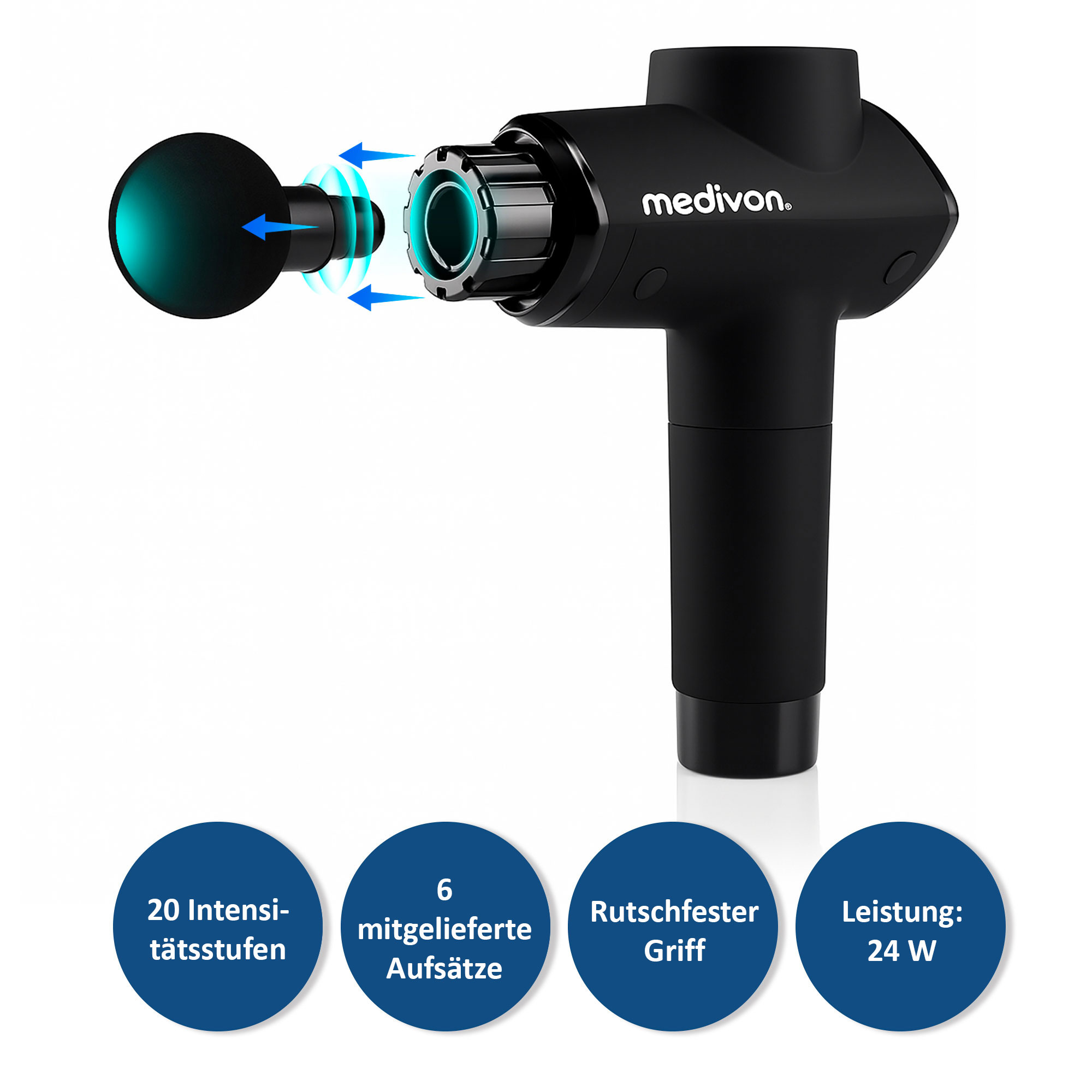 Das Set enthält bis zu 6 wechselbare Köpfe. Jede Muskelgruppe benötigt entsprechende Reize, und dank der 6 verschiedenen Köpfe kann für jede Muskelgruppe der richtige ausgewählt werden, auch für die schwer zugänglichen.