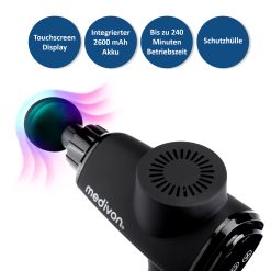 Das Massagegerät ist mit einem Touchscreen ausgestattet, mit dem Sie das Gerät schnell und einfach ein- und ausschalten und die Betriebsgeschwindigkeit ändern können. Das Display zeigt die Laufzeit und den Batteriestand des Massagegeräts an.
