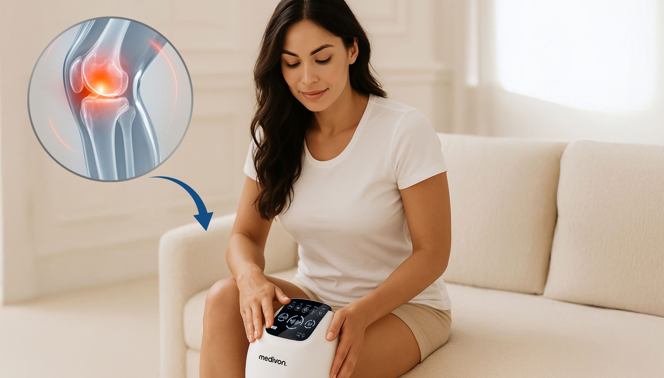 Das Massagegerät Medivon Knee hilft Ihnen, Kniegelenkschmerzen, Muskelsteifheit und Schwellungen in den Knien, Ellbogen und Schultern zu reduzieren. Geeignet sowohl für Sportler als auch für ältere Menschen.