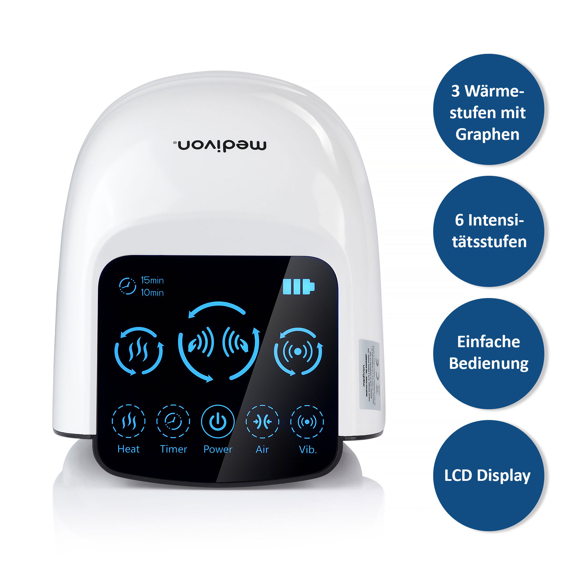Das Massagegerät ist mit 4 Funktionen und 3 Intensitätsstufen der Luft- (Druck) und Vibrationsmassage ausgestattet.Zyklisches Berühren der gewählten Funktion erhöht deren Intensität oder schaltet sie ganz aus.